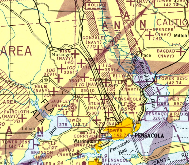 It depicted “Olive (Navy)” as an auxiliary airfield, surrounded by the amazingly dense wartime assemblage of Pensacola-area Navy airfields.
