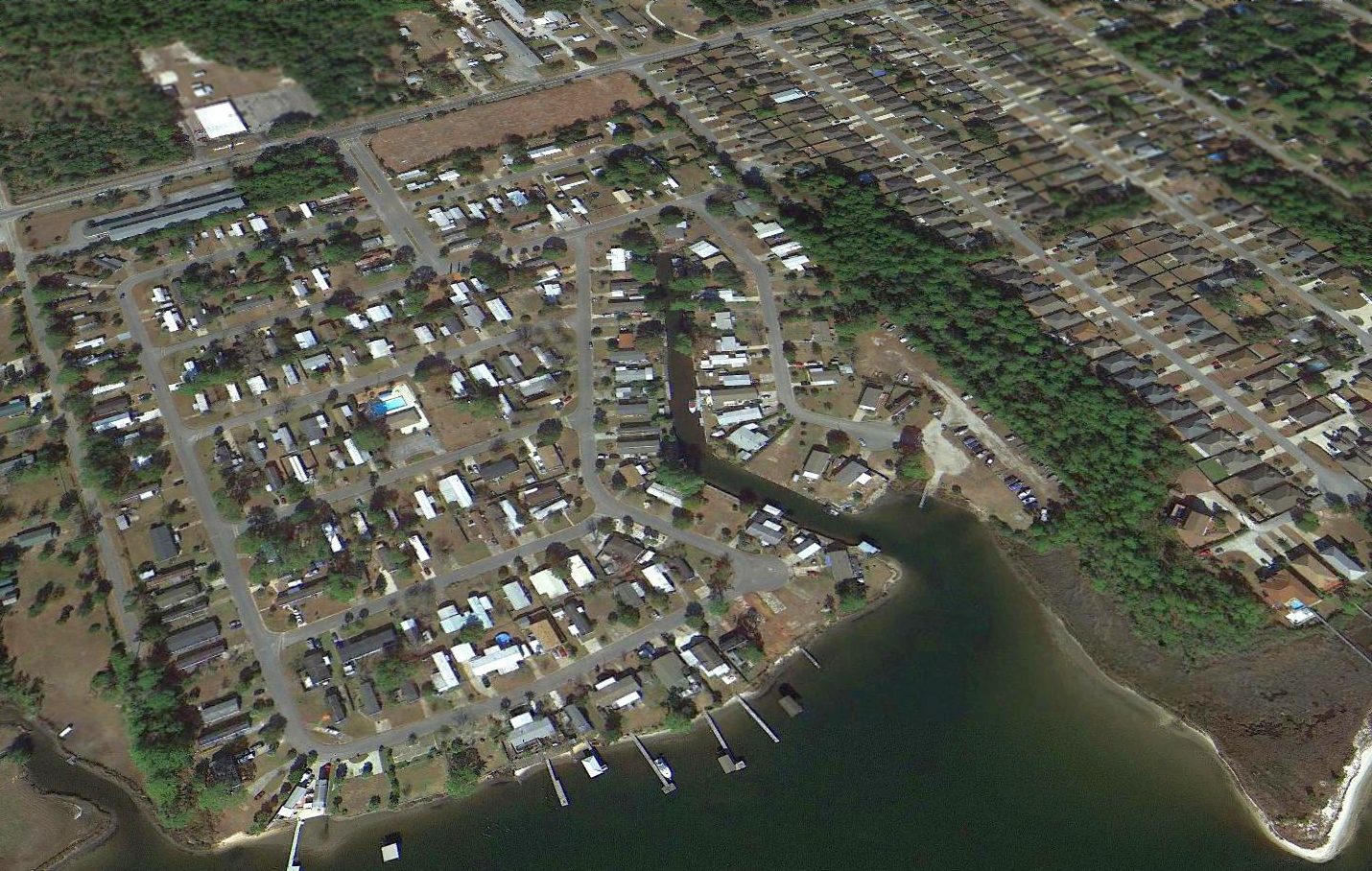 A 1/25/18 aerial view by Alex Price looking northwest at the remains of the Bronson airfield & seaplane ramp.