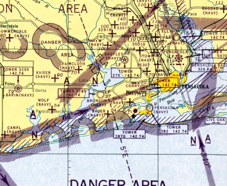 The last aeronautical chart depiction which has been located of Bayou Field was on the August 1956 Mobile Sectional Chart.