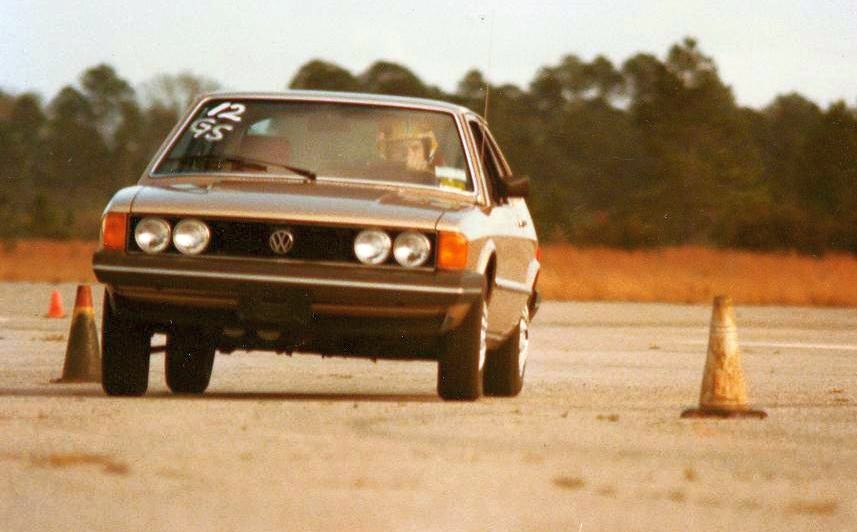 A circa 1977-81 photo of Mark Morgan racing a sleek VW Scirocco on the former Bronson Field runways.