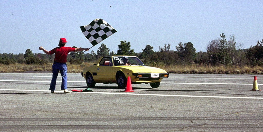 A circa 1976-77 photo of Mark Morgan racing a mighty Fiat X1/9 on the former Bronson Field runways.