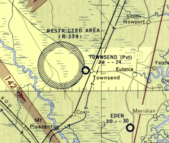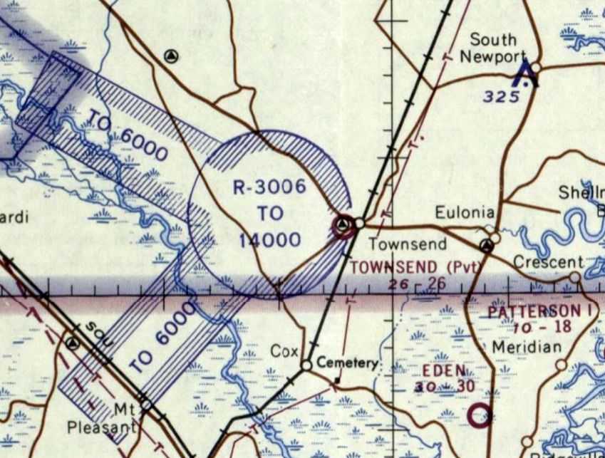 The April 1965 Jacksonville Sectional Chart (courtesy of Lee Corbin) depicted Townsend as a private airfield having a 2,600' unpaved runway, with adjacent circular Restricted Area R-3006 to the west.