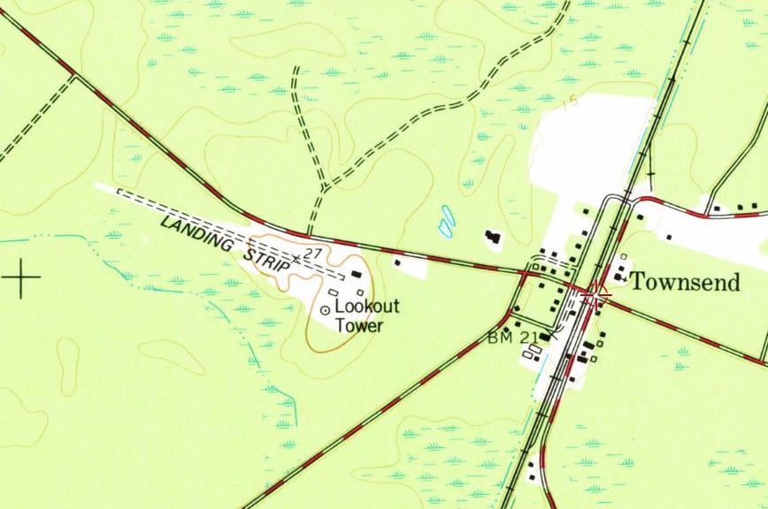 A 1993 USGS aerial view looking northwest depicted Townsend as having a single unpaved northwest/southeast runway, with several small buildings & a lookout tower to the southeast.