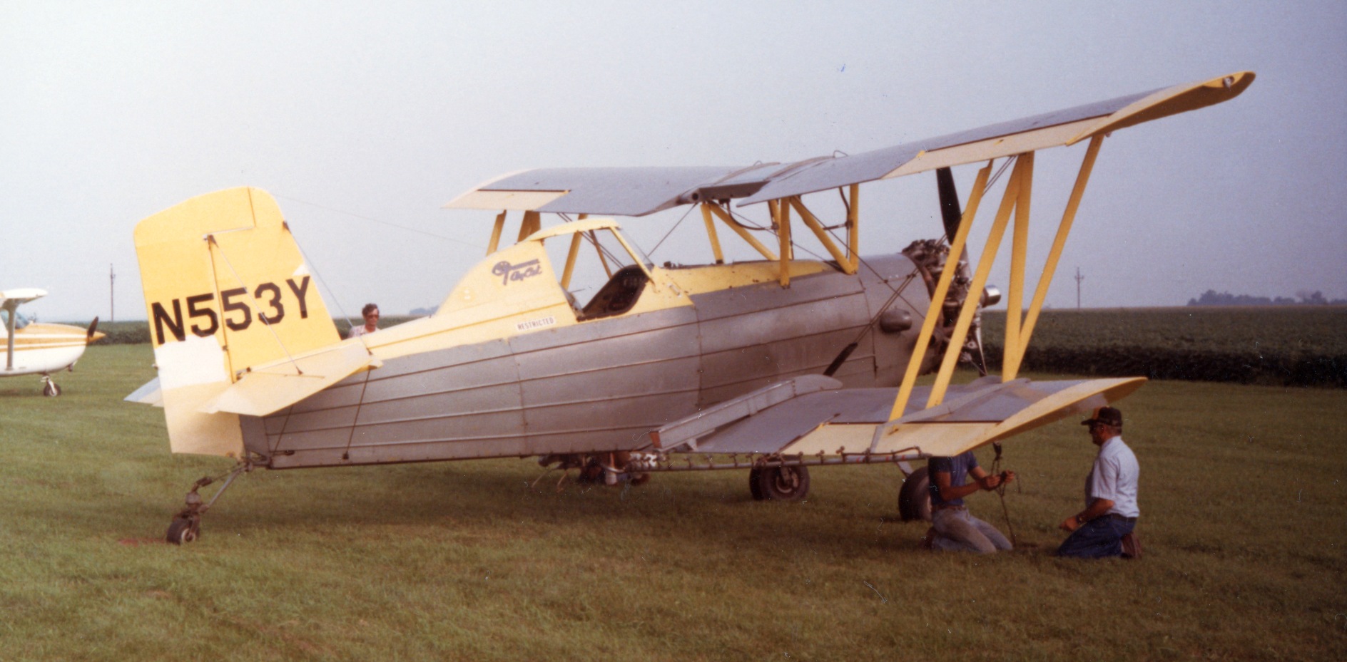 A circa 1980s photo by Nick Williams looking southeast at a Grumman AgCat on the K Field “apron area in front of the hangars that are out-of-view to the left.”