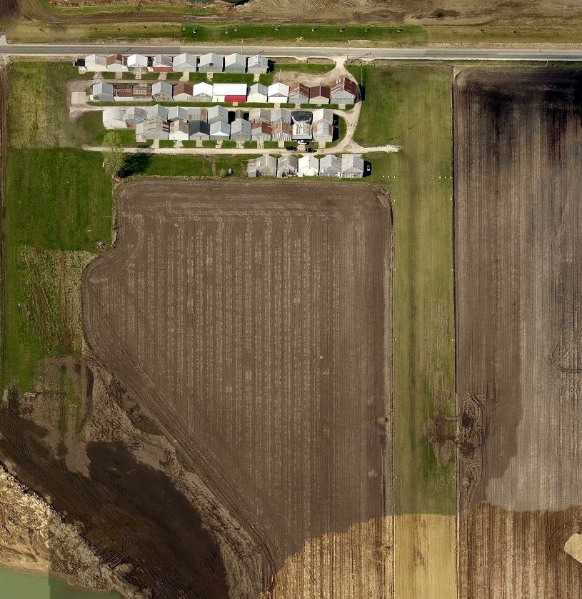 A 6/30/24 aerial view by Nick Paxton looking east at the site of Monona Airport. Nick observed, “The hangars & building are still there (left side of the picture, the red striped buildings).”