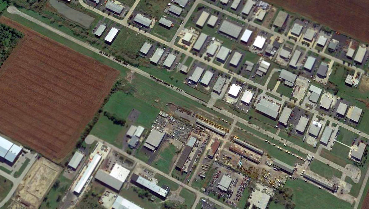 A 2018 aerial view of what appears to be the last remaining aircraft at Frankfort Airport: the remains of a single-engine Cessna on the north side of the field, by this point missing its left wing.