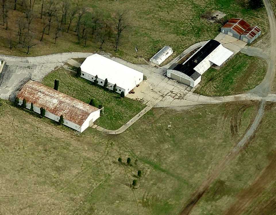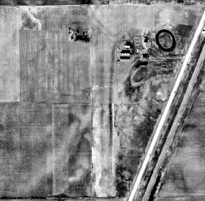 A circa 2006 aerial view looking west at the former hangar which remains south of the Haedtler Field runway.