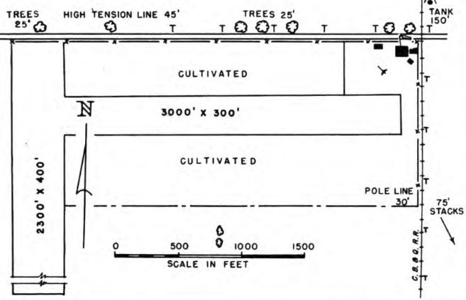 It was said to consist of a 80 acre L-shaped grass field measuring 2,600' east/west, with 3 hangars along the southwest side.
