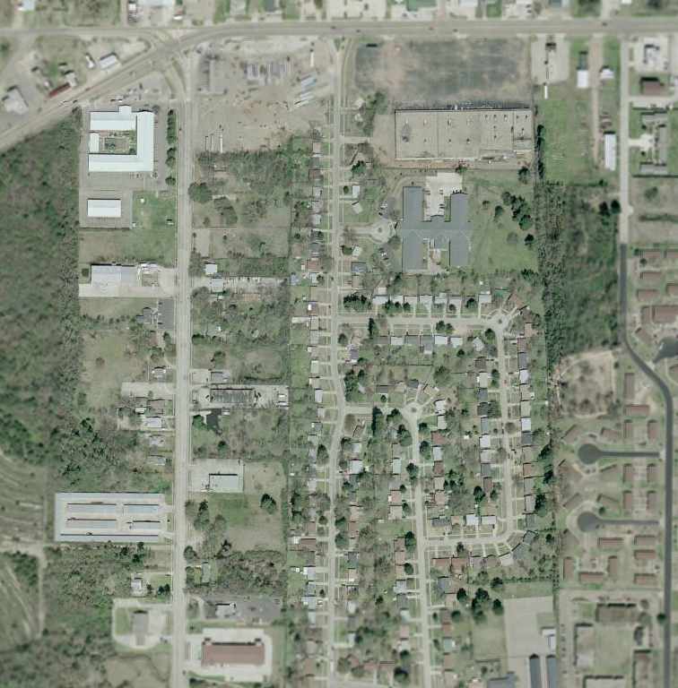 A 2014 aerial view looking southeast shows the majority of the former Ruston Municipal Airport runway remains intact, along with the largest hangar,