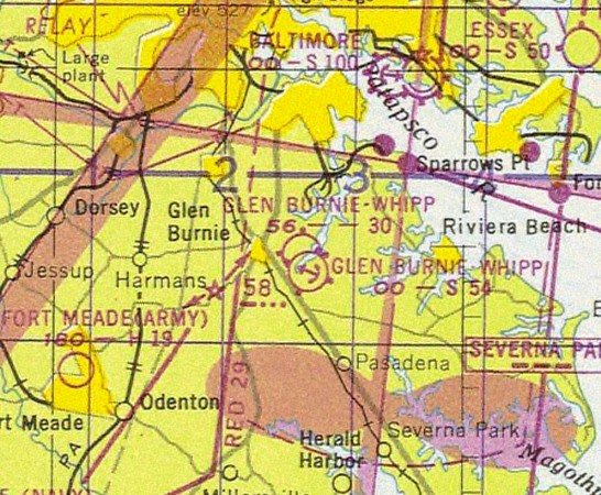 The last depiction which has been located of Glen Burnie - Whipp Airport was on the July 1955 Washington Sectional Chart.