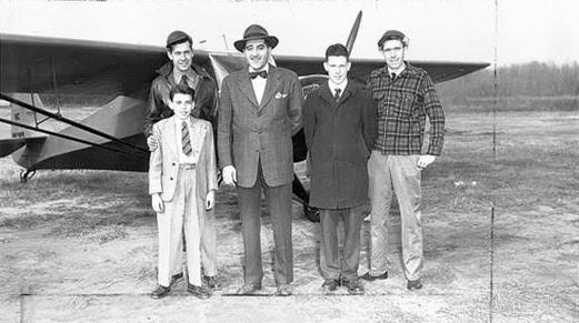 of Edward Haas, Charles B. Haas, and 3 others in front of a Taylorcraft BC12D.