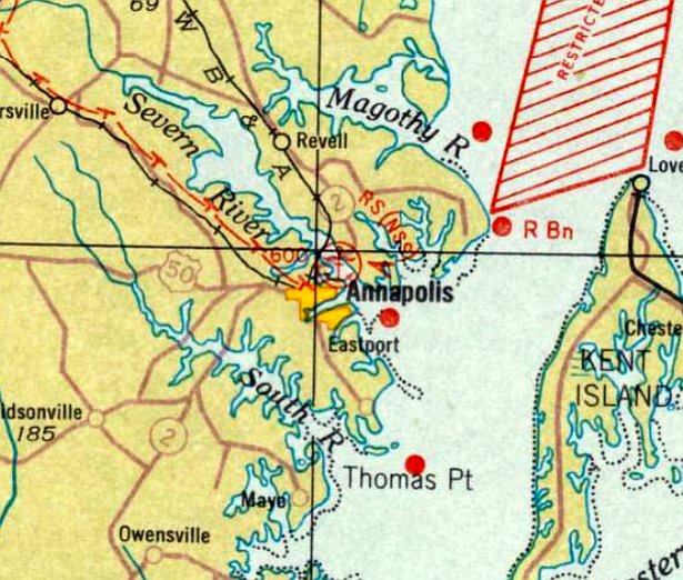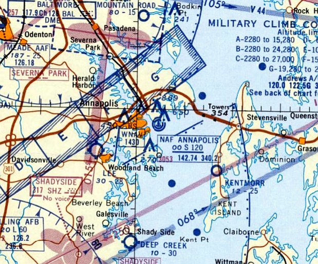 The earliest aeronautical chart depiction which has been located of Annapolis Naval Air Facility was on the July 1934 Washington Sectional Chart.