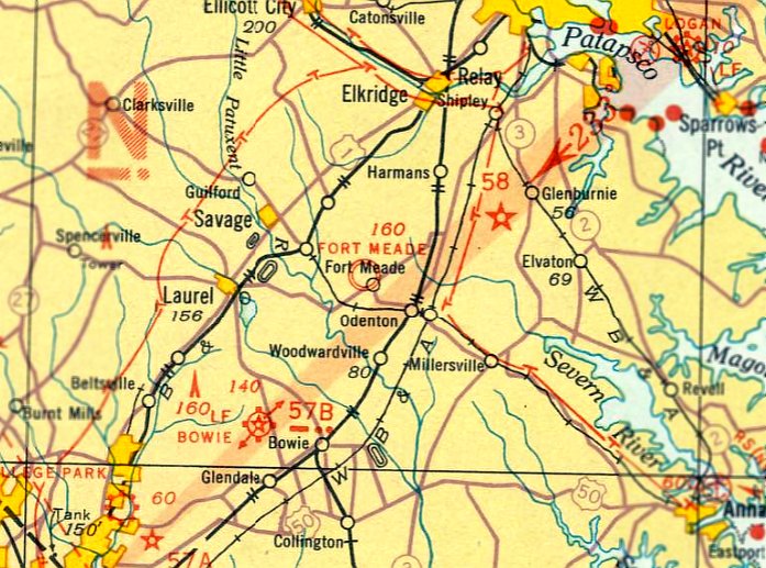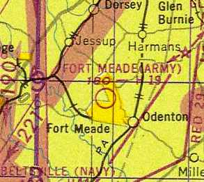 Fort Meade Army Airfield in 1957 was crossed by both MacArthur Boulevard & Mapes Road.