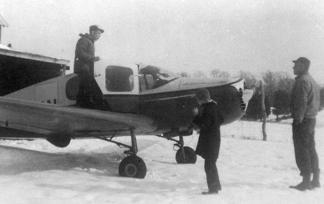 A circa 1950s-60s photo of several people with a Bellanca at a snowy Bassler Airfield (courtesy of David Suter).
