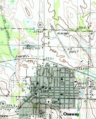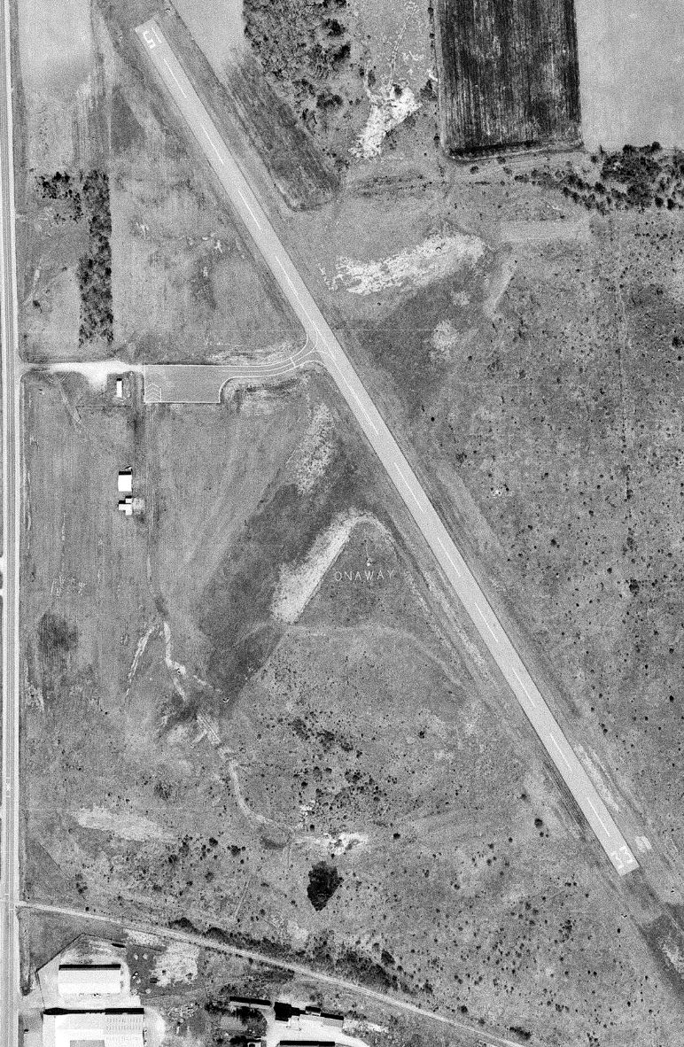 It depicted Onaway as having 2 unpaved runways, with an airport circle marking at the intersection, but with no buildings or other improvements.
