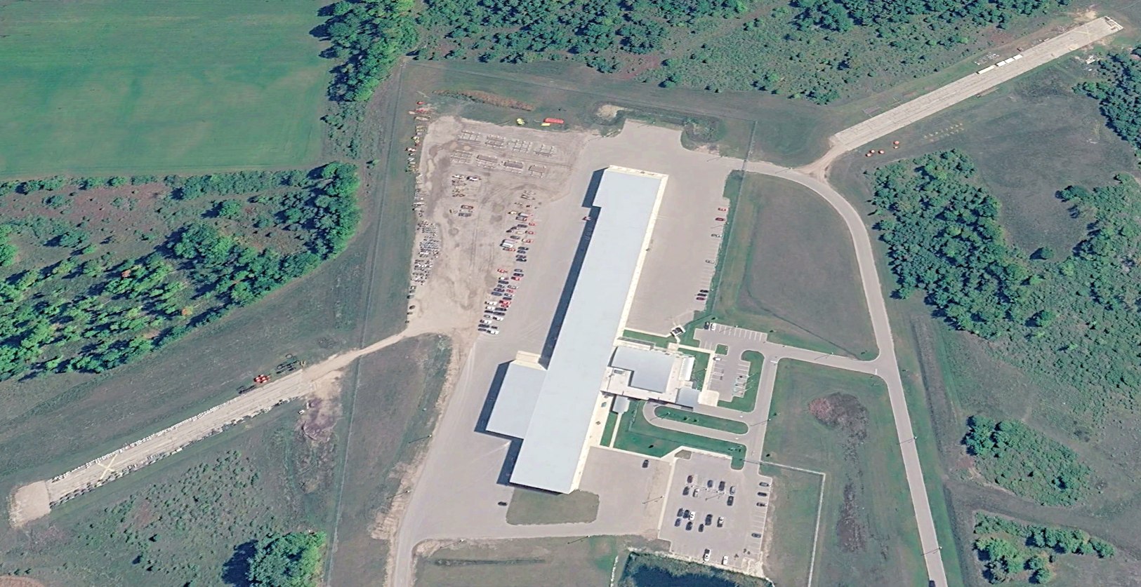 A 2020 aerial view showed a large industrial building covering the center of the former Goetz County Airport,