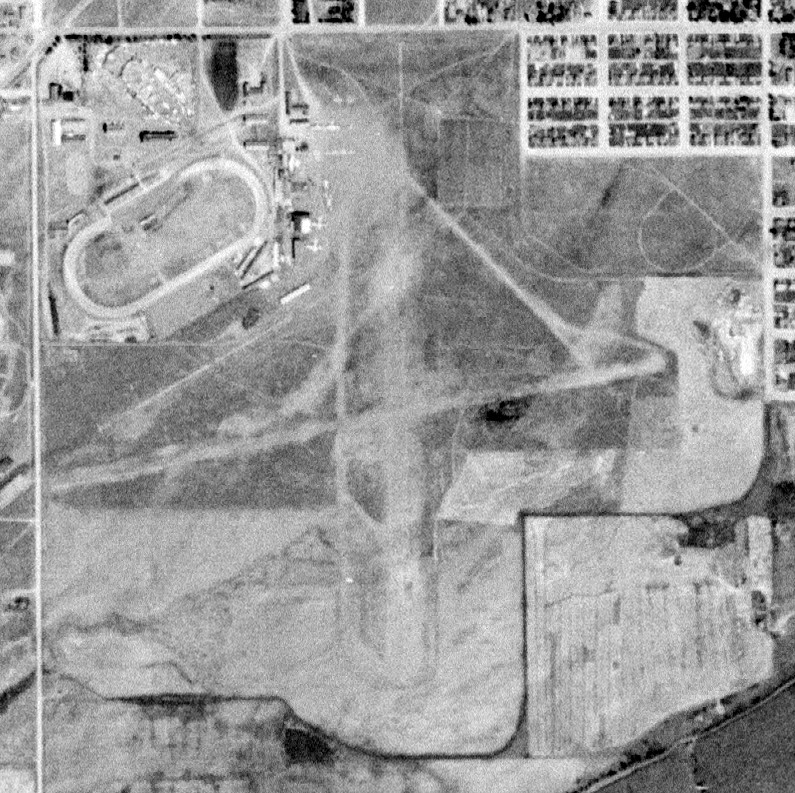 The original airport had been closed, as indicated by the closed-runway “X” markings, and several of the small hangars had been removed.