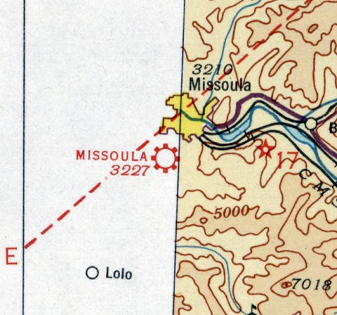 The last aeronautical chart depiction which has been located of the original location of the Seeley Lake Airfield (northwest of Seeley Lake) was on the October 1960 Butte Sectional Chart (courtesy of Scott Newpower).