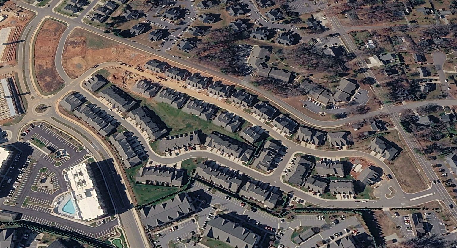 A 2025 aerial view looking northeast showed that suburban houses have covered nearly all the Raleigh Executive Airport site,