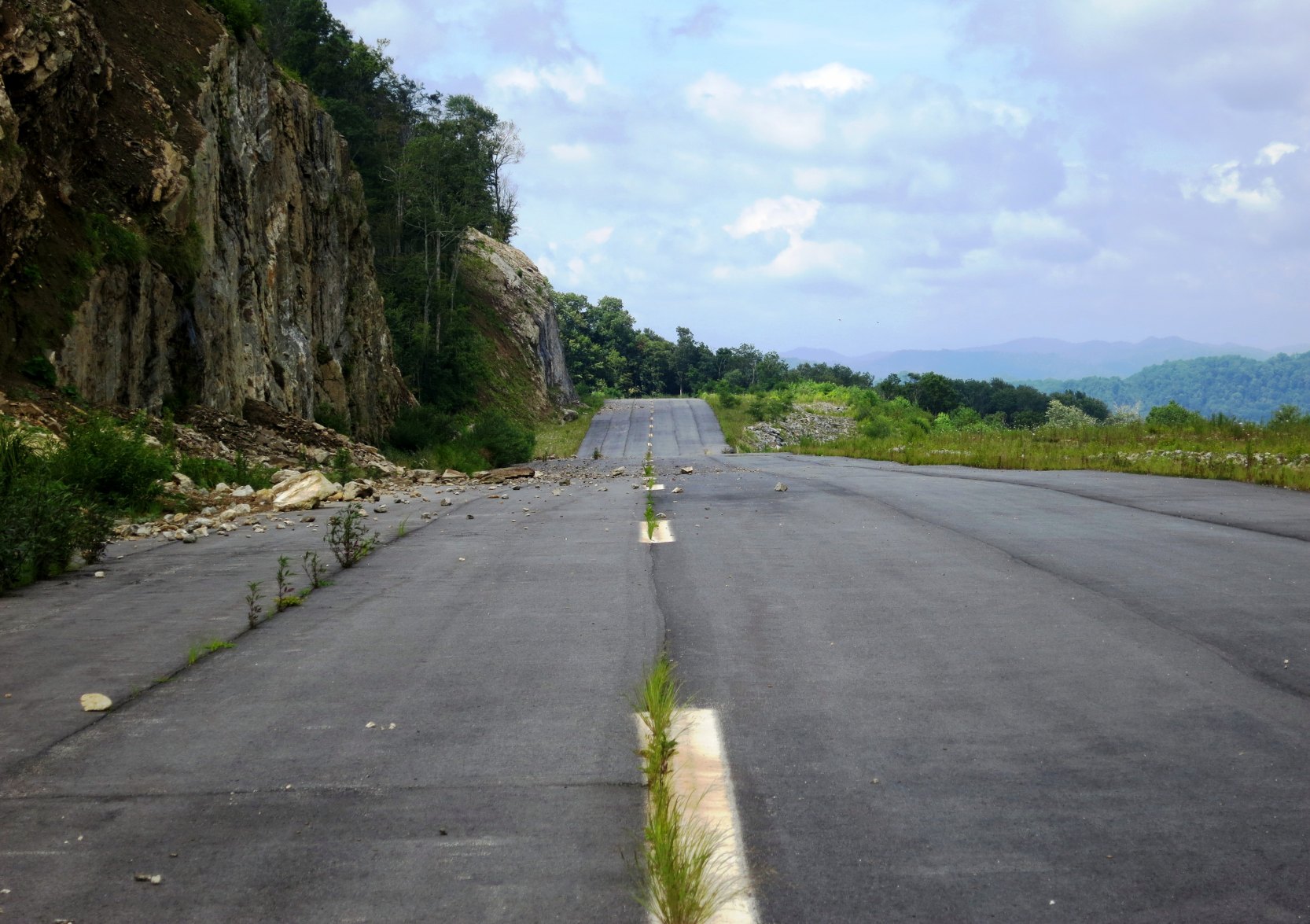 A 2011-2016 photo looking west along the cracked & weed-strewn runway pavement of Skyline Peak Airport.