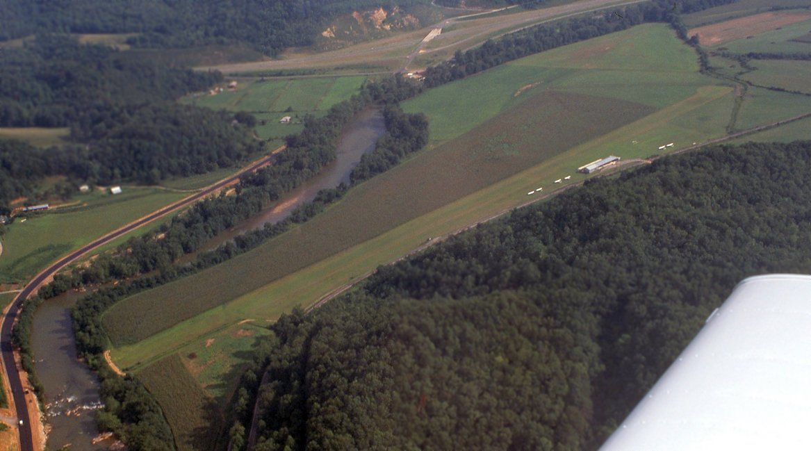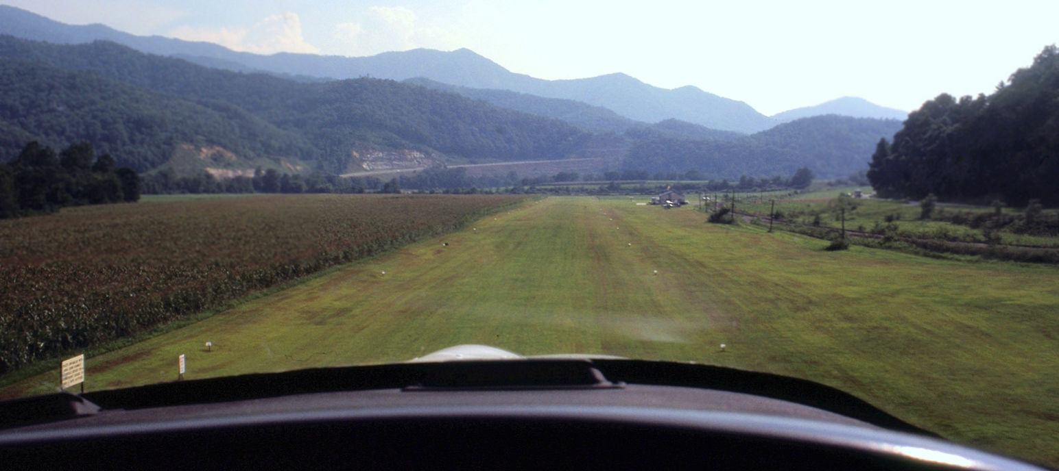 An August 1978 aerial view by Malcolm Taylor looking south at Ferguson Landing Field & the Tuckasegee River on departure.