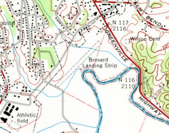 The 1965 USGS topo map depicted “Brevard Landing Strip” as having an unpaved southwest/northeast runway,
