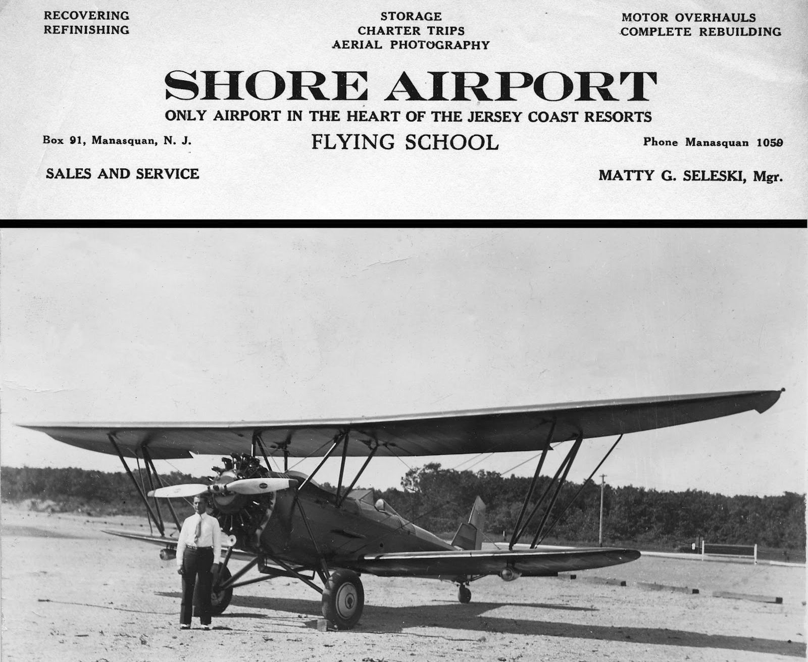 A circa 1930s advertisement for Shore Airport featured an undated photo of a man in front of an unidentified biplane (courtesy of Joe Doherty).