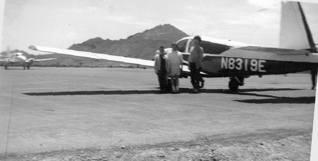 with Mike Marson just visible behind the fuselage on right, in front of their rented N8319E, a 1959 Mooney M20A, serial #1497.