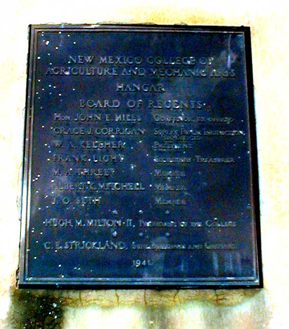 A 2005 photo by Jonathan Westerling of 1941 plaque of the “New Mexico College of Agriculture & Mechanic Art Hangar”.