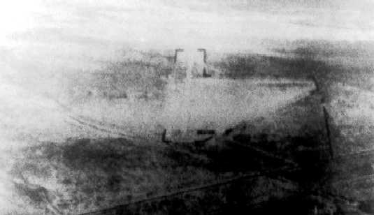Several buildings still standing north of the runway may have been hangars or other airport buildings.