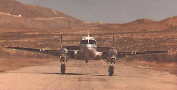 A photo of a Pronto Aviation Services Beech 18 taking off from Sunland Park during the summer of 1981 (courtesy of Jaime Carreon).