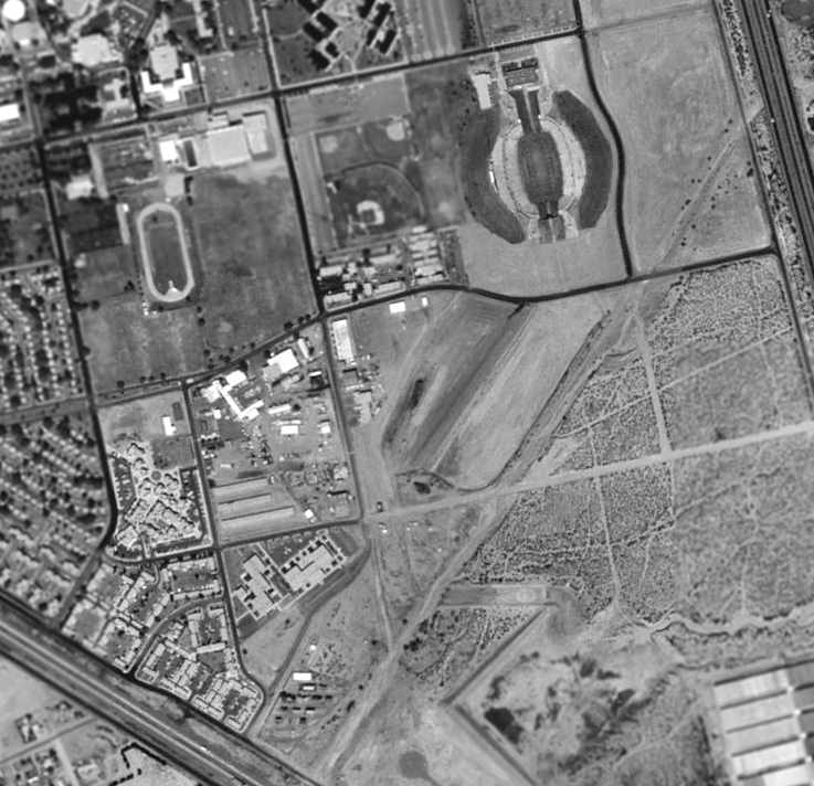 As seen in a 1991 USGS aerial view looking northwest, the former Sunland Airpark still existed, but in a somewhat deteriorated condition.