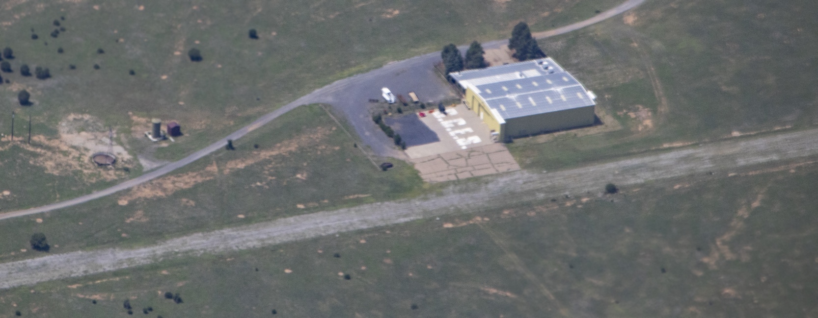 A building has C.C.E.S. lettering on the concrete apron of a small hangar.”