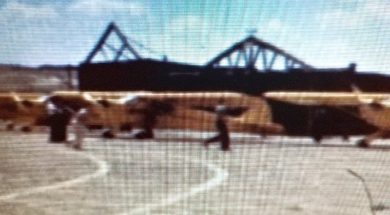 A still from a September 1940 movie by James Bickle of a delivery flight of several new Piper Cubs, in front of the hangars of the original Gallup Airport (courtesy of Bill Bickel, via Dan Rhinehart).