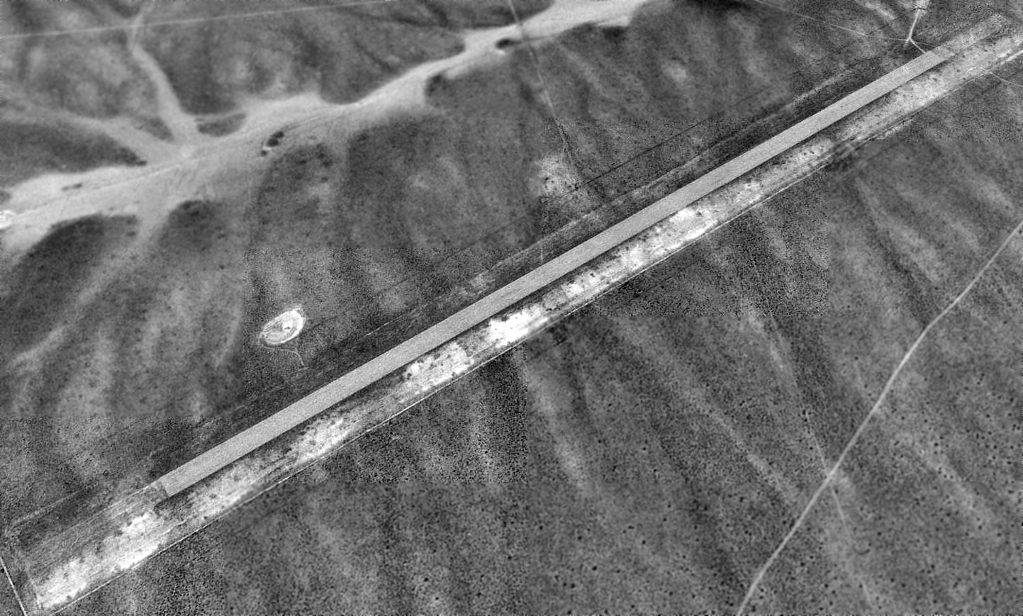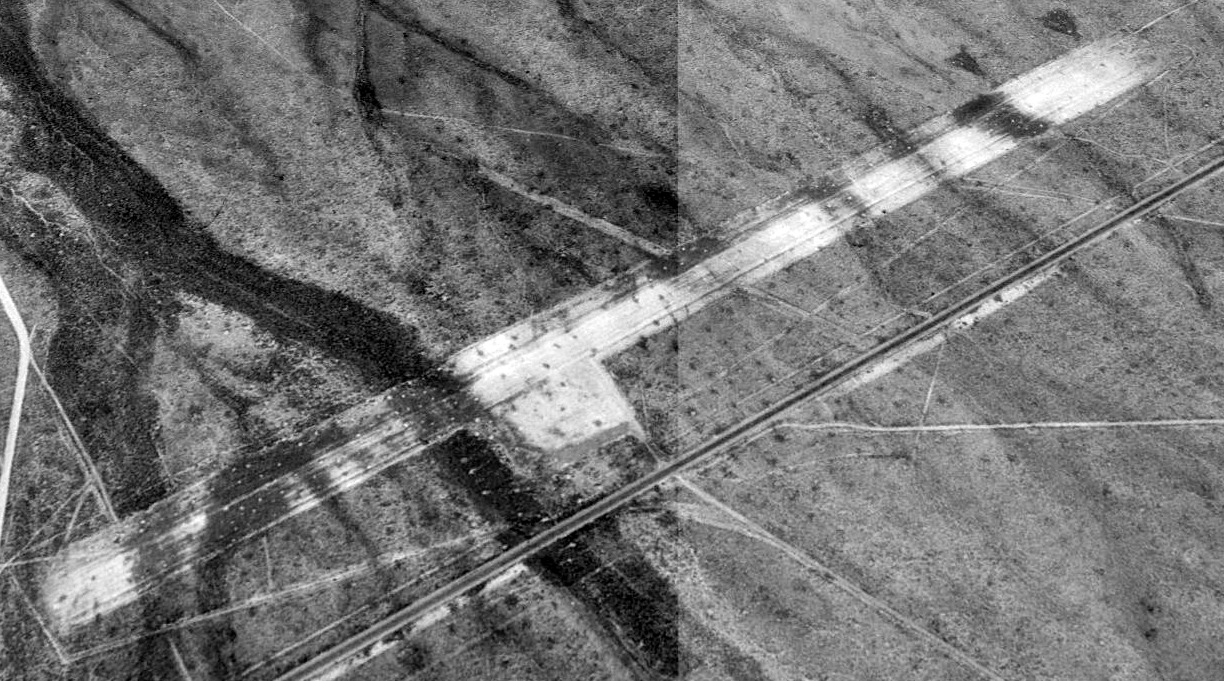 In a 1999 USGS aerial view looking northwest, the Caliente Flight Strip runway was remarkably well preserved, considering that it was built 56 years prior.