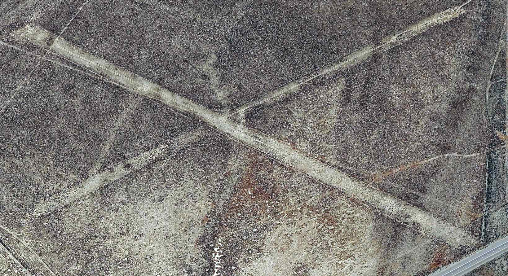 A 2023 aerial view looking southwest showed the 2 Oasis Airfield runways still remained recognizable.