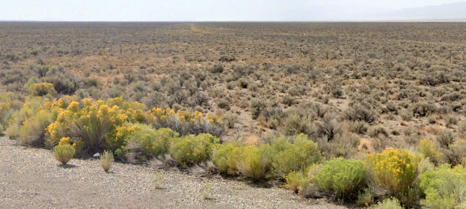 A 2024 photo looking south along the alignment of the Oasis Airfield north/south runway showed no recognizable trace of a runway.