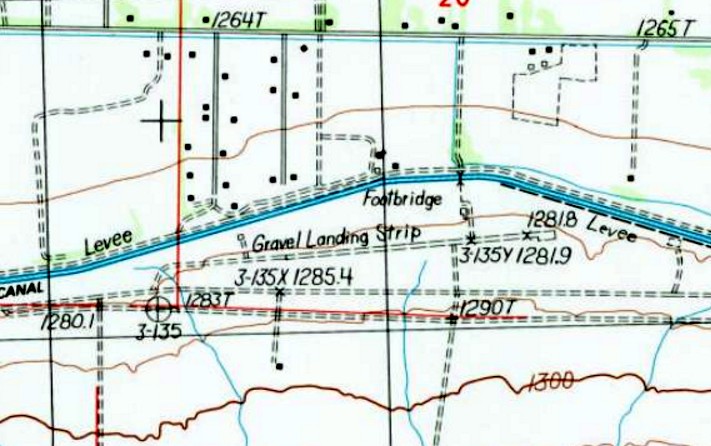 The 1968 USGS topo map depicted a single northeast/southwest unpaved runway, labeled “Landing Strip”.