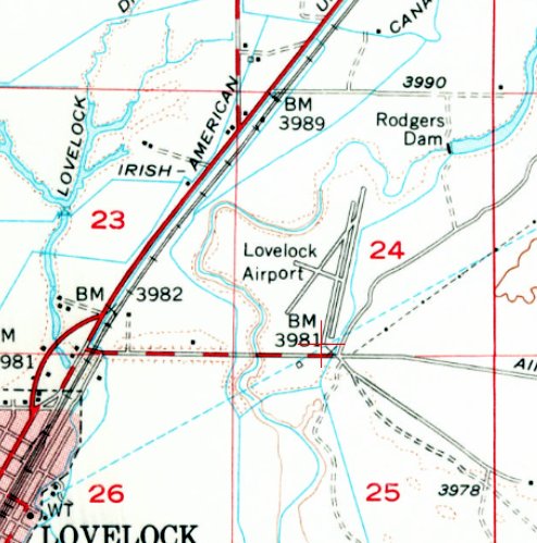 The earliest topo map depiction which has been located of Lovelock Airport was on the 1956 USGS topo map.