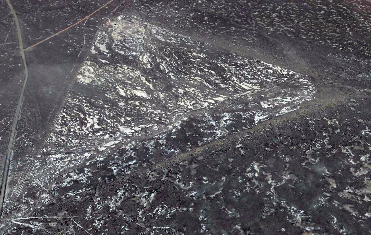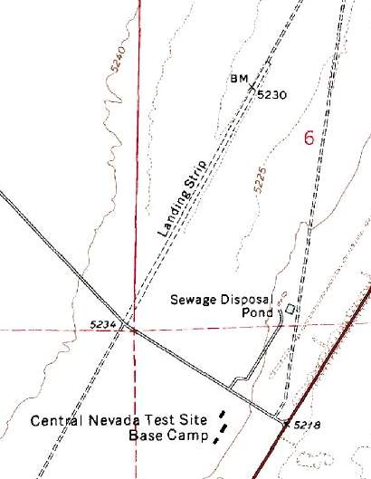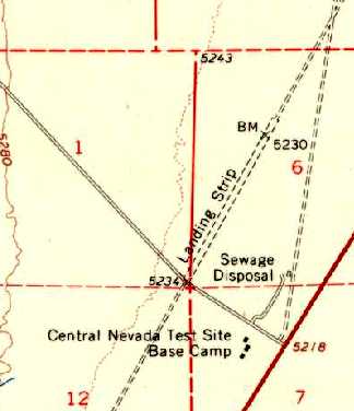 The only buildings depicted were 3 small structures across the road to the south, labeled “Central NV Test Site Base Camp”.