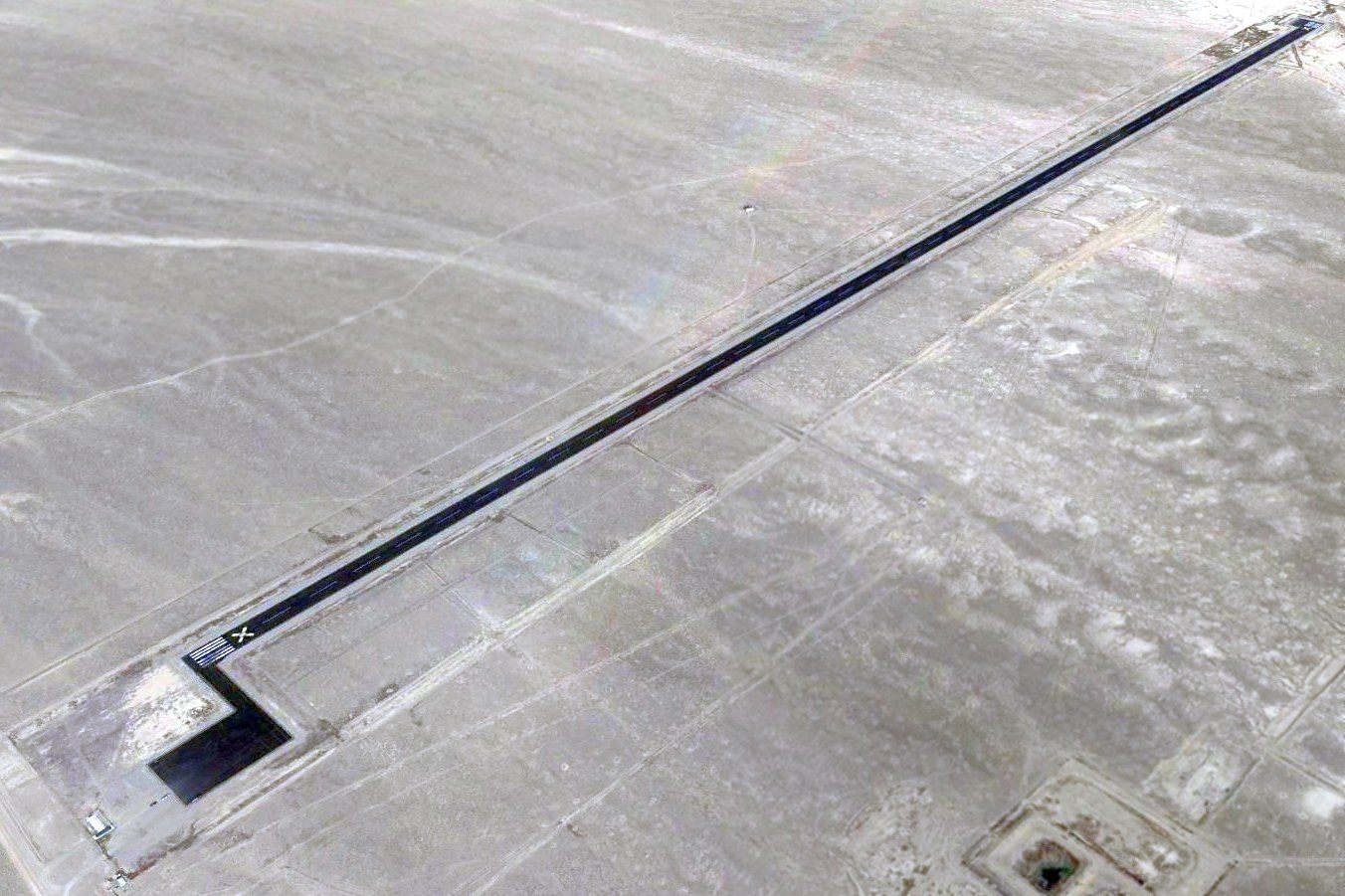 A 2014 aerial view looking northwest at Basecamp's runway, showing the closed-runway “X” symbols.
