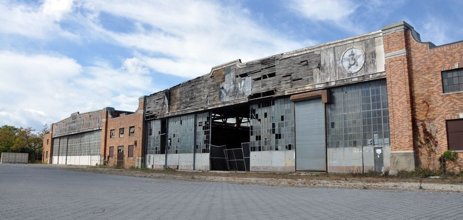 A sad 10/7/25 photo of Floyd Bennett Field's deteriorating Hangars 3 & 4.