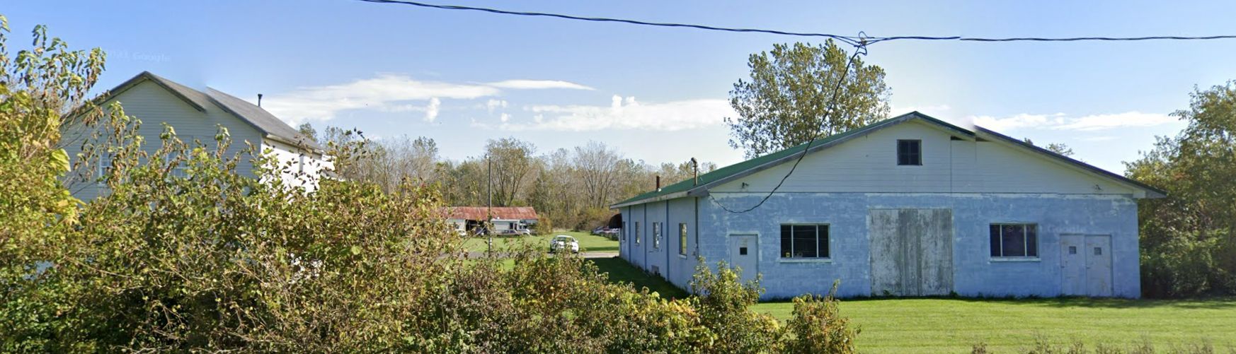 A 2021 photo looking east at the former Ellington Aircraft Salvage Company hangars.