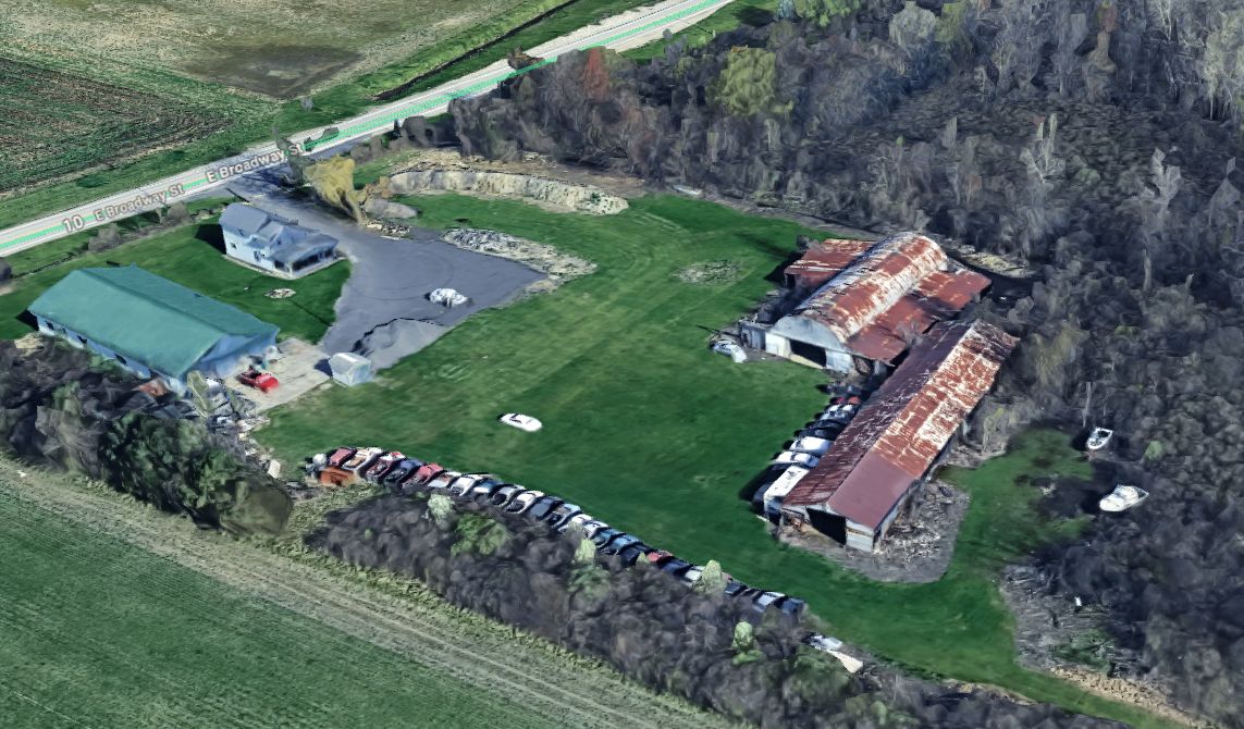 A 2024 3-D aerial image photo looking northwest at the former Ellington Aircraft Salvage Company hangars.