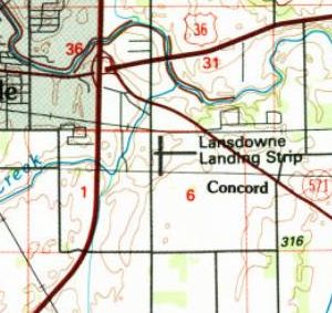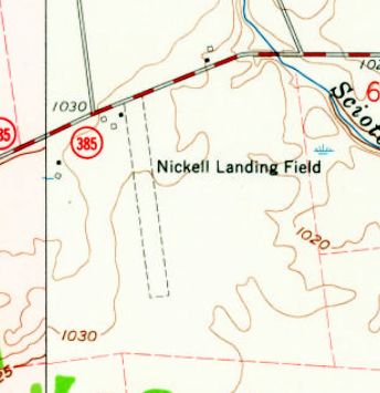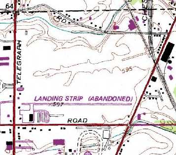 It depicted a single unpaved north/south runway, labeled generically as “Landing Strip”, with 1 small building on the west side.