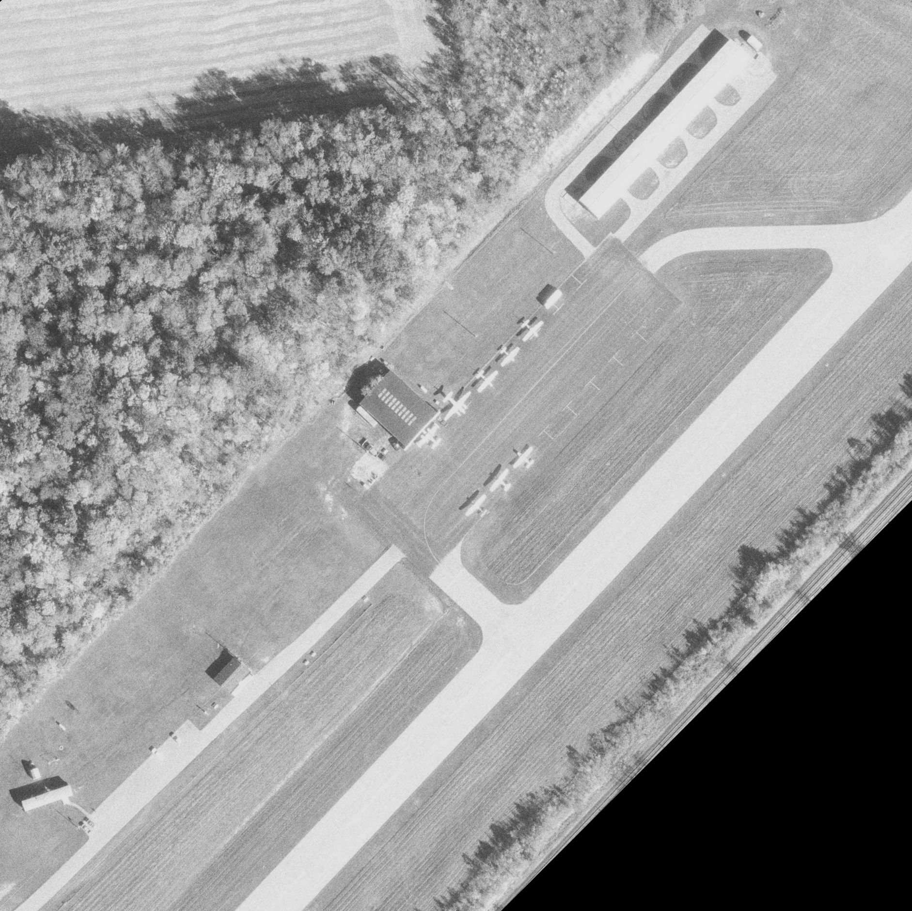 It depicted Sandusky Airport as having a northeast/southwest grass runway with an airport circle marking, and 7 light single-engine planes & 6 T-hangars on the north side.