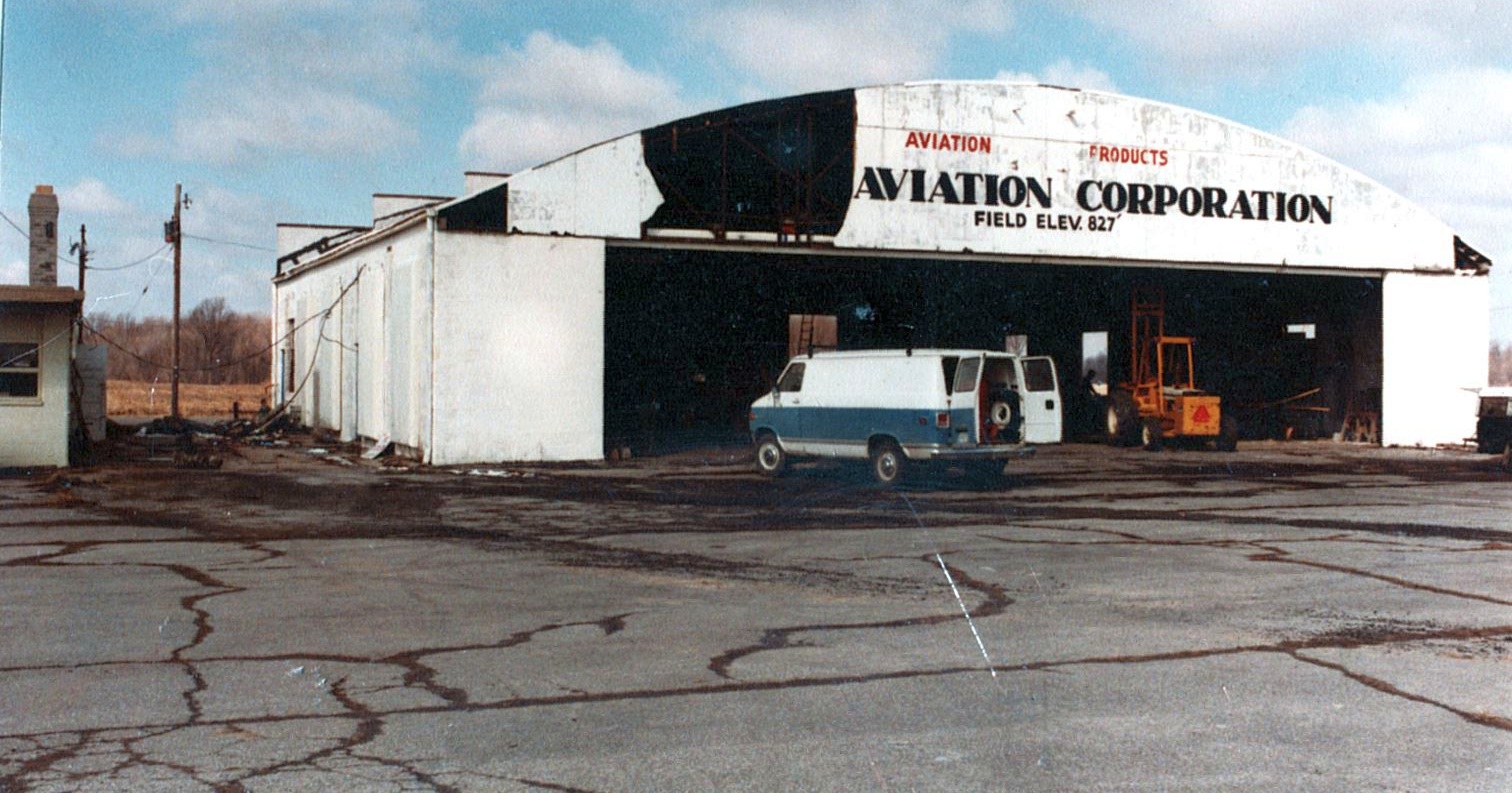 A circa 2007 aerial view looking west at the 2 former Waco hangars on the northwest side of the complex.