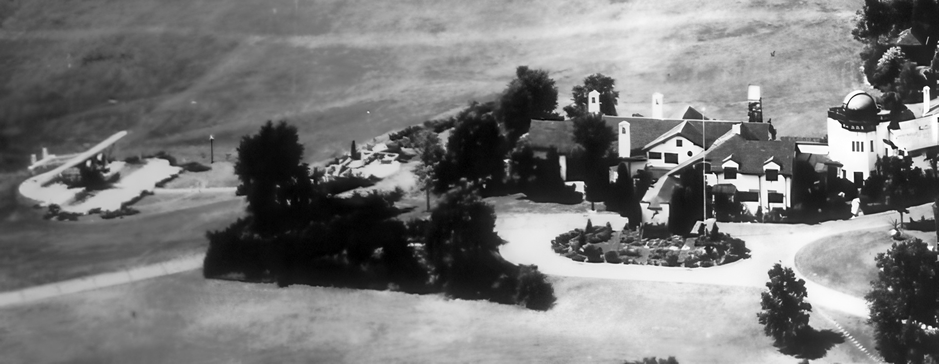 A circa 1930s aerial view of the unusual arrangement of hangars at Wright Field.