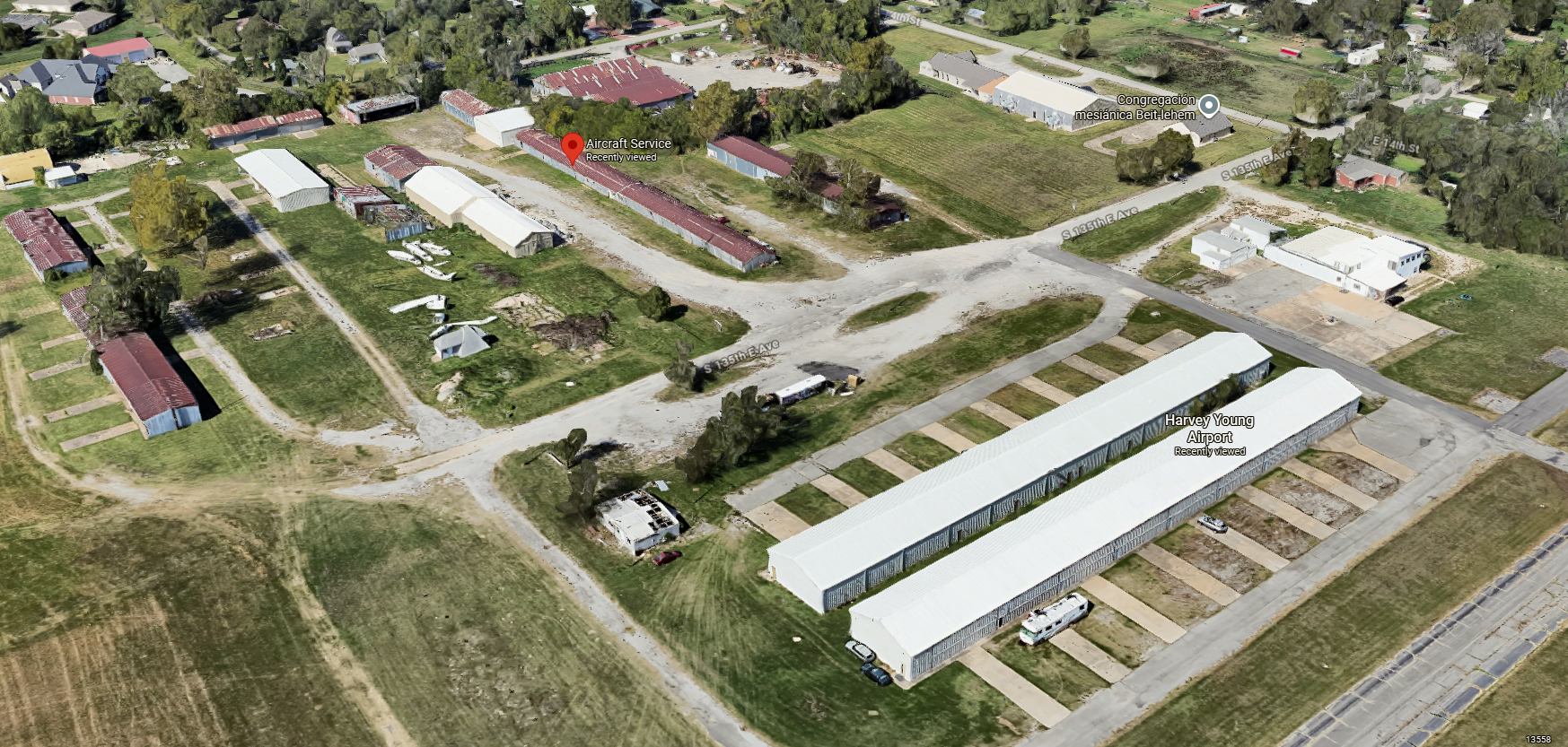 A 2025 3-D aerial image looking northwest at the Harvey Young Airport hangars.