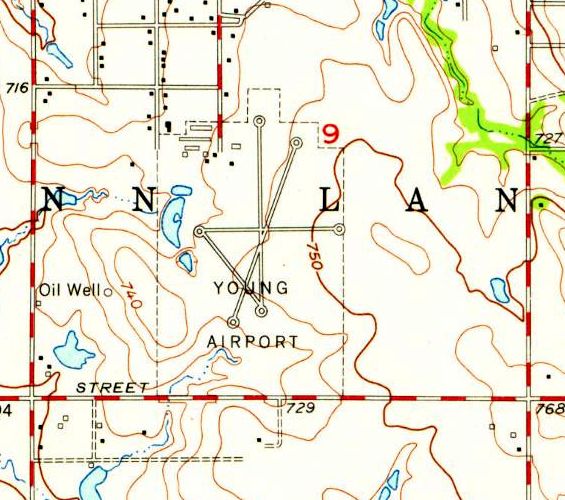 The earliest topo map depiction which has been located of Young Airport was on the 1956 USGS topo map.